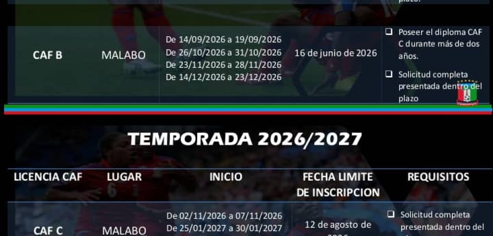 El calendario exacto de las diferentes formaciones CAF 2026 se puede consultar en la imagen de abajo. La integración en la Convención CAF y la preparación de la primera CAF A representan un verdadero punto de inflexión para el fútbol ecuatoguineano. La FEGUIFUT sitúa ahora la formación en el centro de su estrategia de desarrollo. Gracias a estos importantes avances, Guinea Ecuatorial se está dando hoy los medios para elevar de manera sostenible el nivel de sus entrenadores y fortalecer la competitividad de su fútbol a nivel africano.