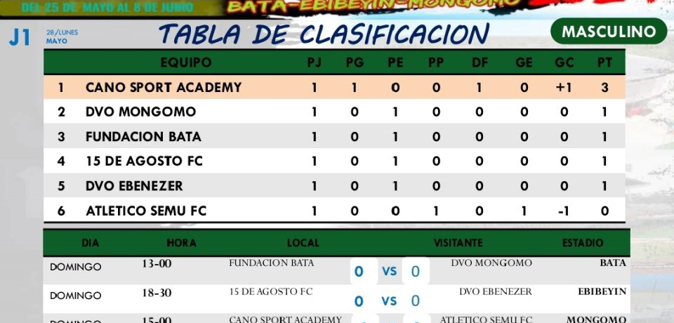 La primera jornada de la liguilla nacional de fútbol ha arrancado este domingo en el estadio de Nkoantoma con el encuentro entre Fundación Bata y Deportivo Mongomo.